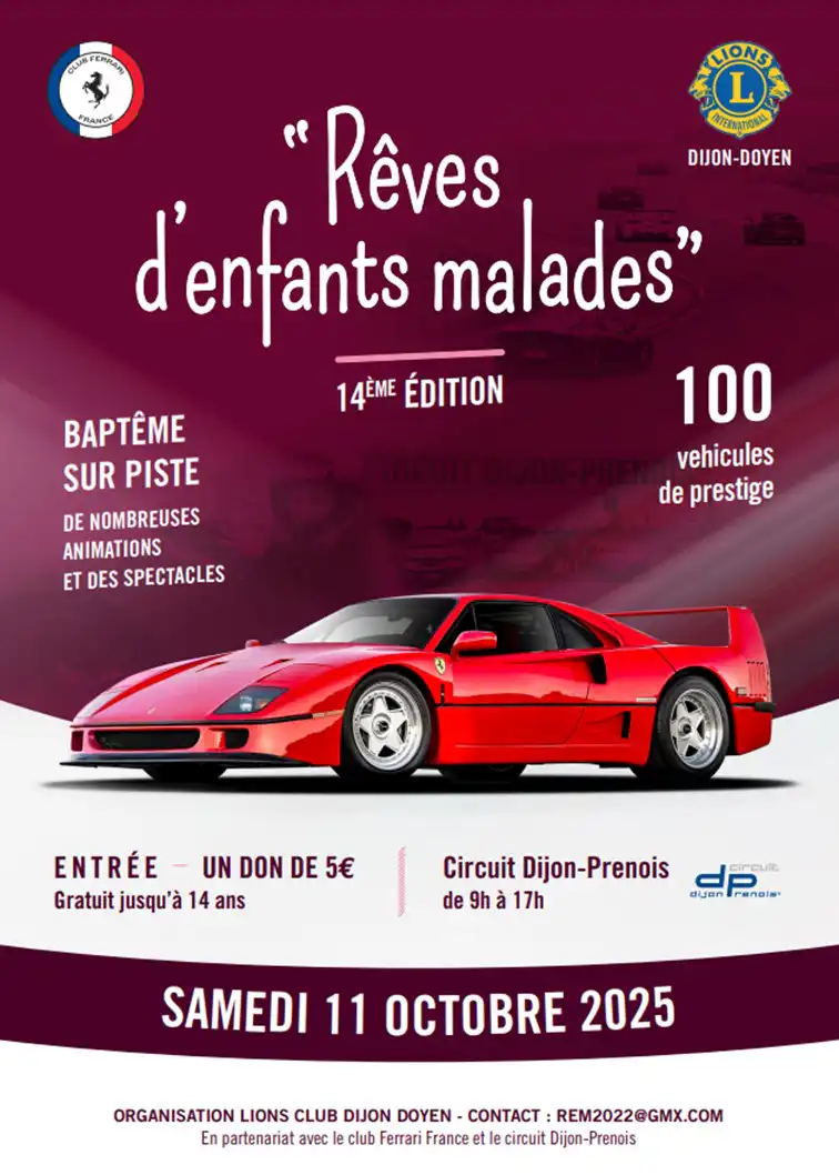 Une journée de soutien et de bénévolat au service des Enfants Malades organisée par <br>le LIONS CLUB DIJON DOYEN, le CLUB FERRARI FRANCE et le CIRCUIT DIJON-PRENOIS.